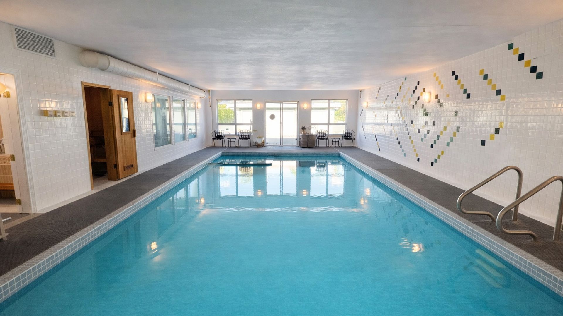 A bright, private indoor retreat, this pool features sunlight-streaming panel doors, a toddler-friendly stair entry with gradual depth, and newly renovated changing facilities.