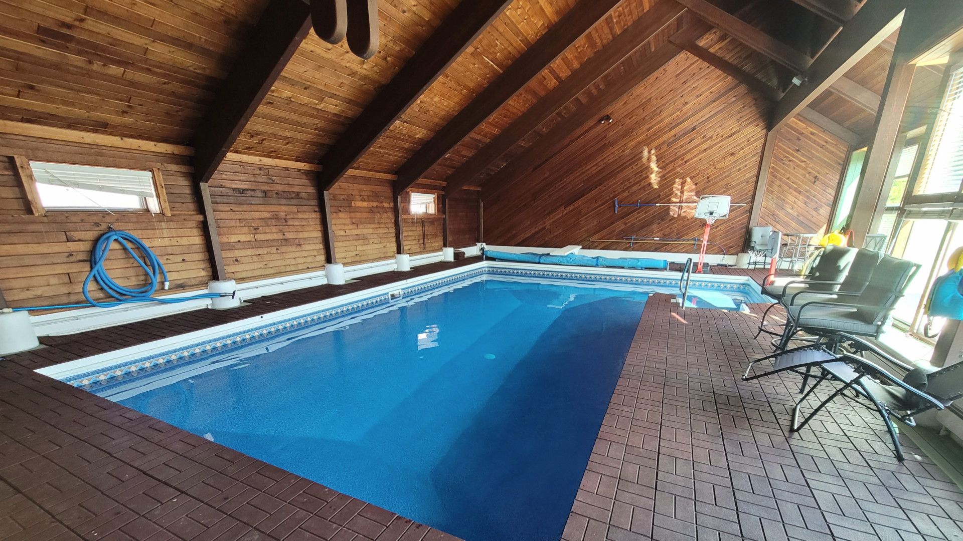A cozy cedar-lined indoor pool with natural light, perfect for swimmers of all ages to learn and grow.